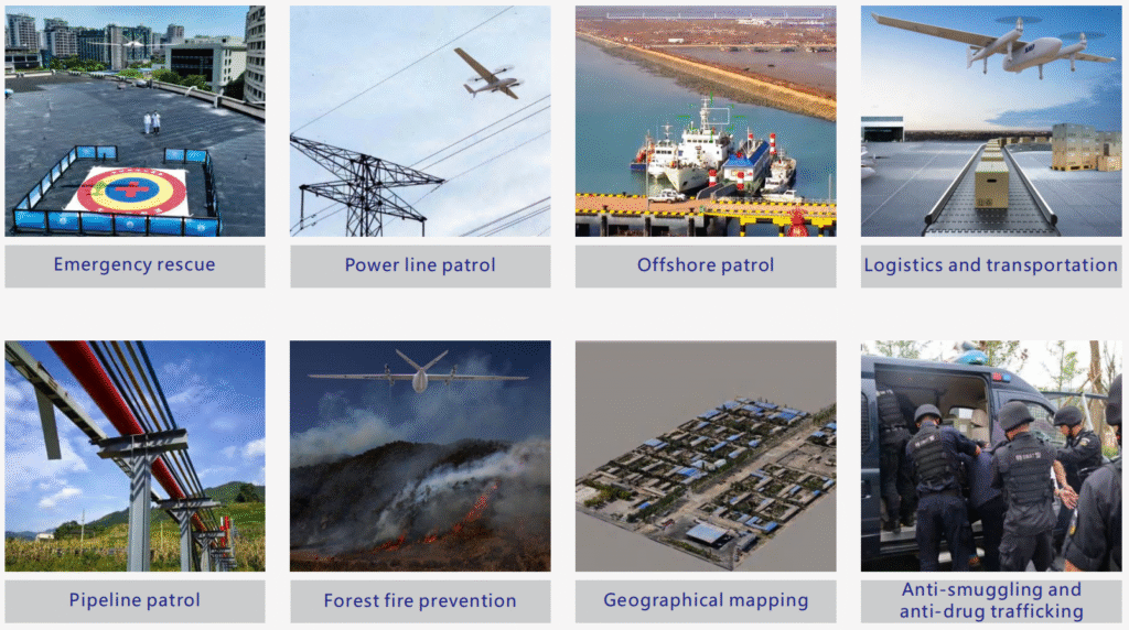 We are engaged in R&D and manufacturing VTOL(vertical takeoff and landing) fixed-wing UAV drones, which is widely used in aviation logistics (especially in medical industry), emergency rescue, environmental protection, public safety, energy inspection, island surveillance.