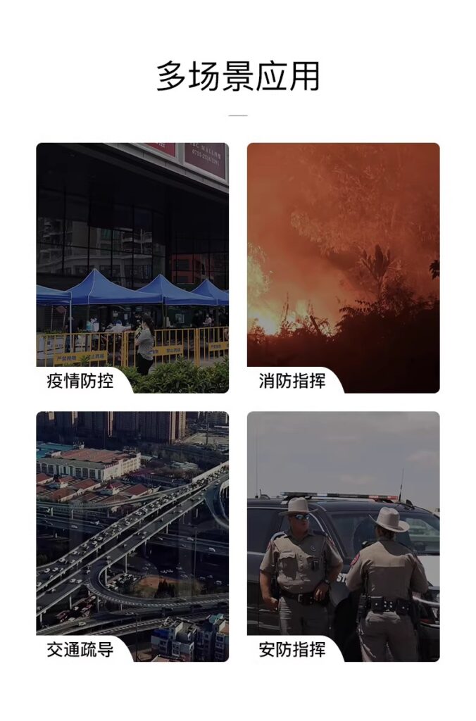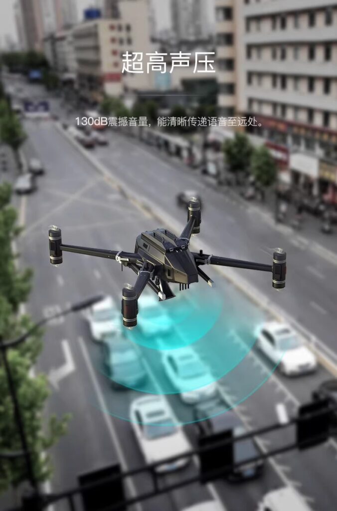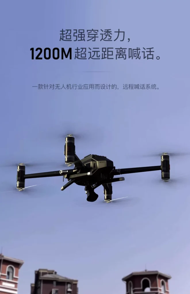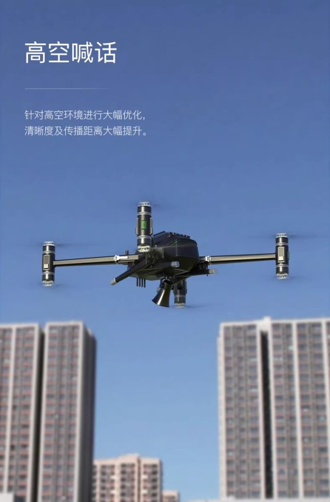 4G dual-link drone loudspeaker for real-time aerial command and rescue, remote high-altitude broadcasting.