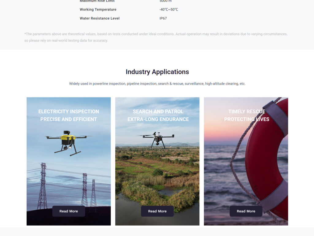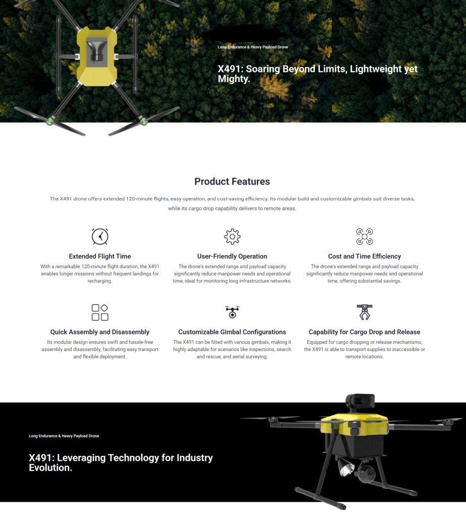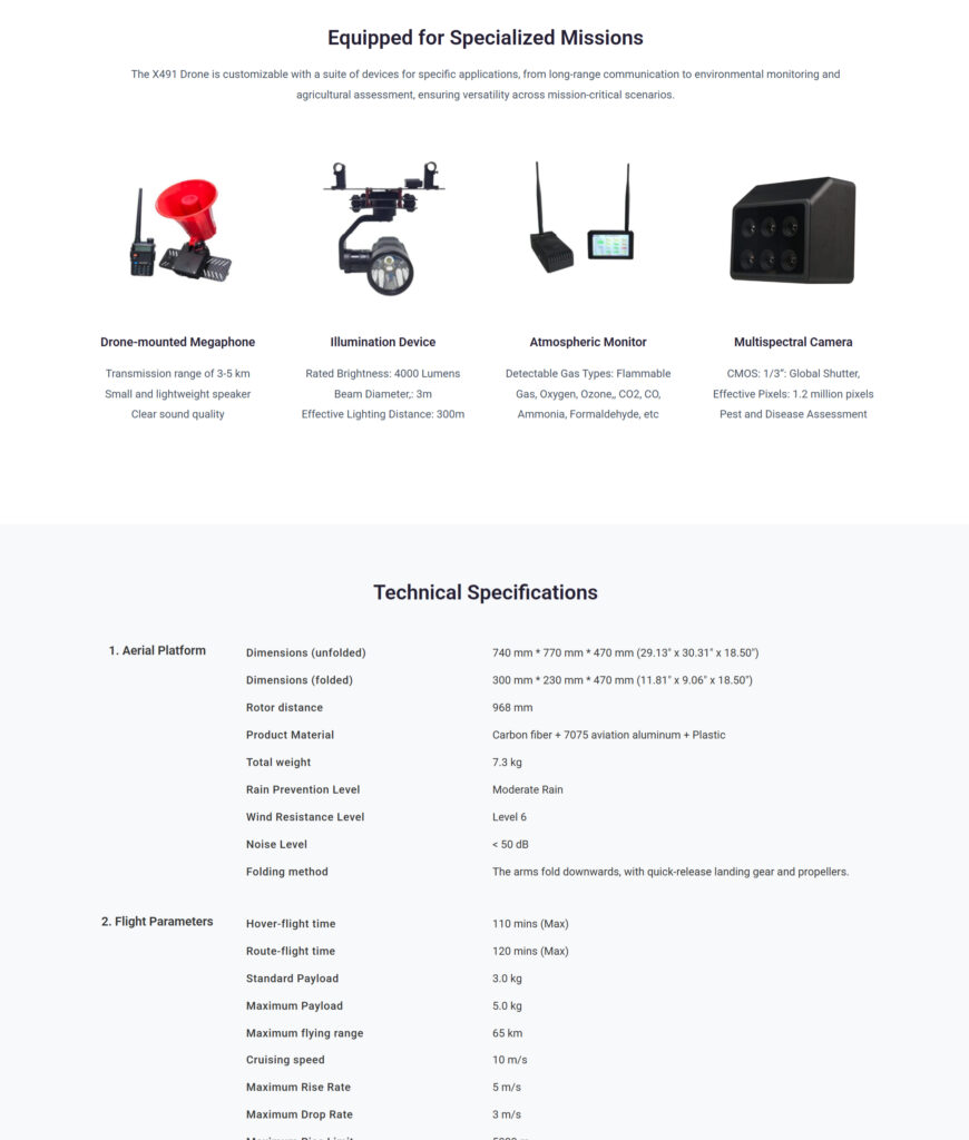 5kg payload drone, with a 120-minute flight time and Max. 5kg payload, can travel up to 65km. Featuring modular, quick-assembly design and integrated flight control, it supports manual and autonomous modes. Compatible with remote controllers and various ground stations. It can be equipped with various gimbal options such as single-light, dual-light, and triple-light for applications in power line inspection, pipeline monitoring, and search and rescue missions. Additionally, it can be fitted with dropping or releasing mechanisms for delivering supplies