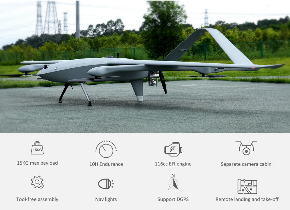 the hybrid VTOL drone can carry a 15kg payload for 4 hours.