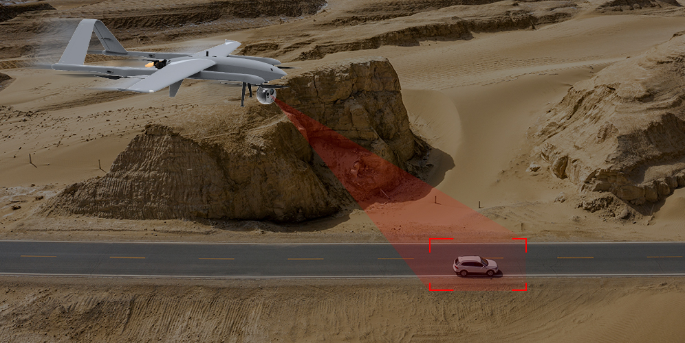 This surveillance VTOL can follow and monitor a stationary or moving target of interest along a routine patrol route if the onboard drone zoom camera tracks it. Additionally, the target’s coordinates can be copied and shared with the command center. Once the monitoring is complete, the VTOL drone can return to its original patrol route.