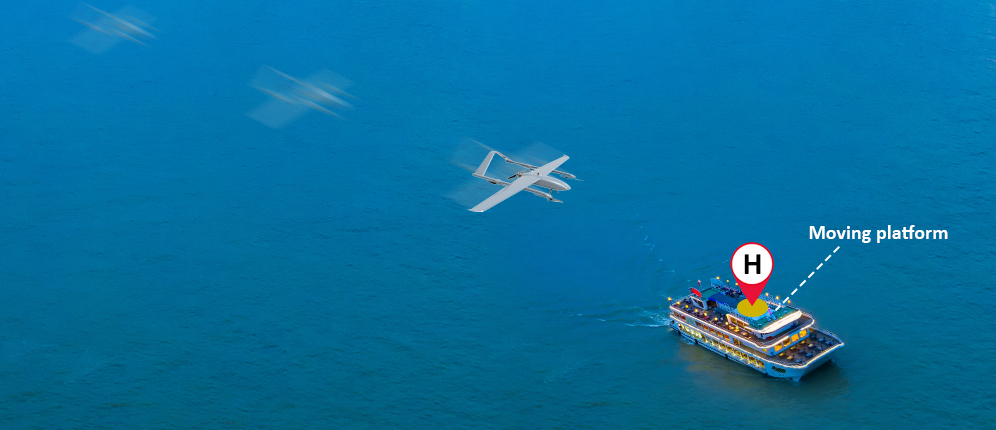 Sometimes, the flight platform, such as a boat or a vehicle, needs to move after the drone takes off to complete a mission. In this scenario, the drone must be capable of following the moving flight platform and landing once the task is completed. This feature is very useful when the VTOL drone is conducting a surveillance or monitoring mission on the sea.