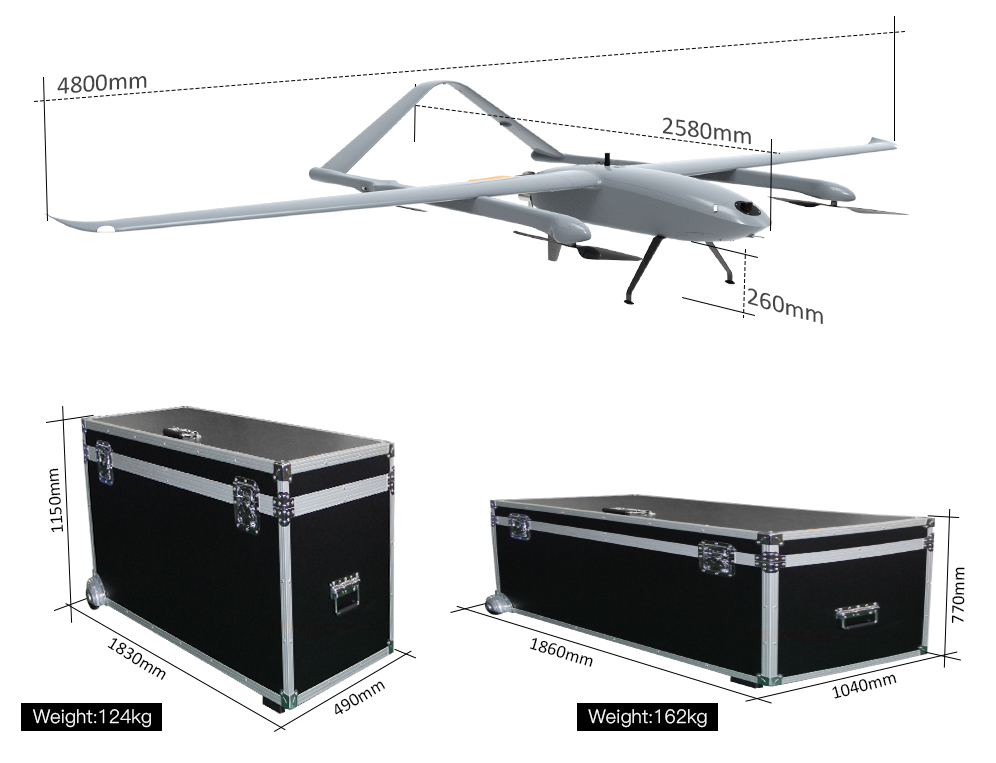 GL500 hybrid (battery and petrol) fixed-wing VTOL drone is specially designed for missions that conventional electric VTOL drones can’t do: 15kg heavy payload delivery and 10 hours of ultra-long endurance aviation. Given its stable structure and high reliability, it is an excellent UAV platform for emergency cargo delivery, long-distance coast patrol, oil pipeline inspection, border monitoring, etc.