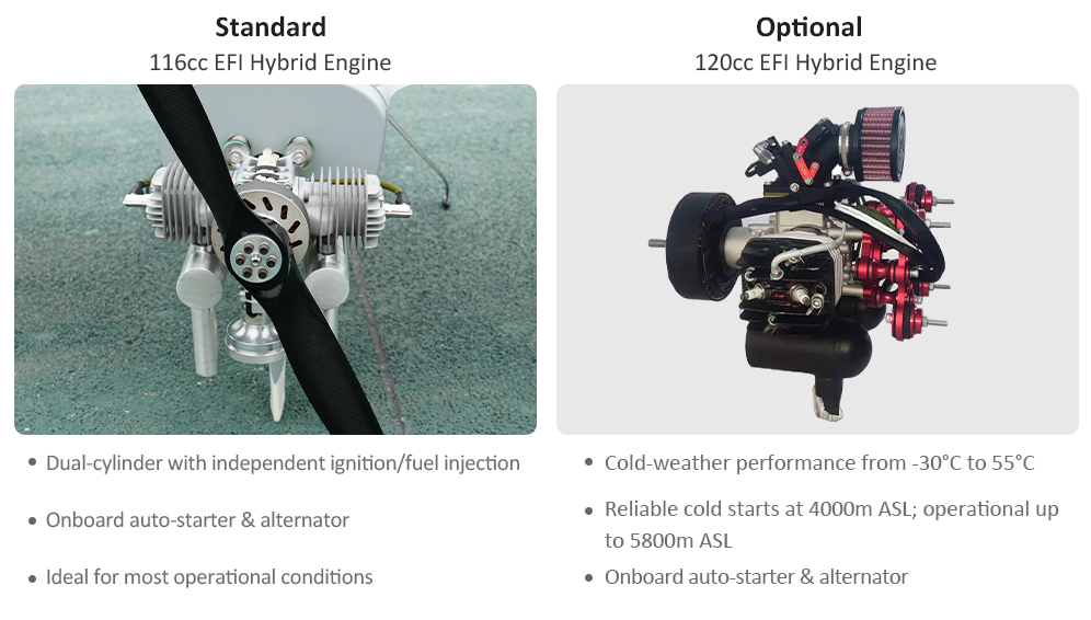 YANGDA provides two hybrid engine options for the gasoline VTOL: the standard 116cc EFI engine, and an optional 120cc version optimized for high-altitude and low-temperature missions, available upon request.