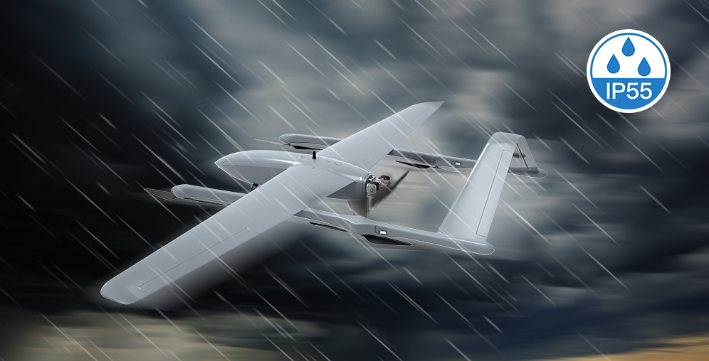Due to its anti-water design on the fuselage, the Sky Whale Max gas VTOL drone is weatherproof and can reach an IP55 rating. In this case, the waterproof VTOL aircraft can carry out urgent missions on rainy days, like search and rescue.